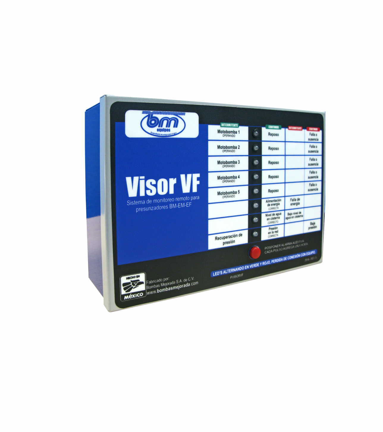 El Visor VF es un tablero de monitoreo remoto que se coloca en la caseta de vigilancia, la oficina de mantenimiento o cualquier otro lugar conveniente para mantener informado al personal sobre la operación de los equipos hidroneumáticos y en caso de tener algún problema repáralo a la brevedad.
